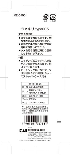 -. Binding : Health and Beauty -. Brand : Kai -. EAN : 0793379193410 -. Feature : Medium sized curved blade and handle / Weight of die-cast lever helps to convey the strength and trim firmly / Comes with a nail catcher to catch trimmed nails / Stainless steel nail file made by etching provides smooth filing and easy shaping -. IsAdultProduct : 0 -. Label : Kershaw -. Manufacturer : Kershaw -. Model : 000KE0105 -. MPN : - -. PackageQuantity : 1 -. PartNumber : - -. ProductGroup : Beauty -. ProductTypeName : BEAUTY -. Publisher : Kershaw -. Studio : Kershaw -. Title : Kai 005 Nail Clipper -. UPC : 793379193410