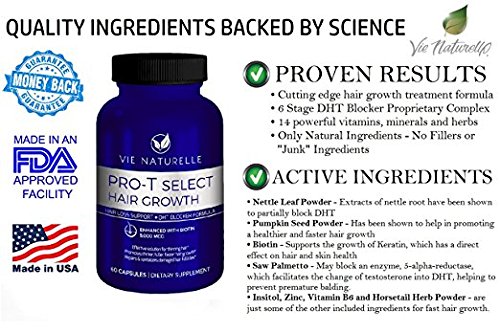Vie Naturelle's Pro-T Select Hair Growth Supplement has been meticulously formulated to work as a complete inside out nourishment to support proper follicular function. Each ingredient is strictly backed by scientific studies to ensure optimal results. With our unique blend of essential vitamins, herbs, and minerals this cutting edge hair loss product will help address various deficiencies that have been known to cause hair loss in men and women of all ages.