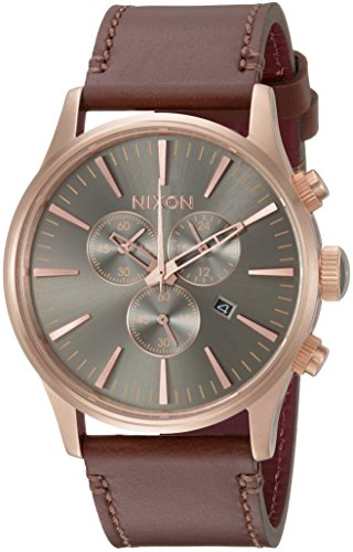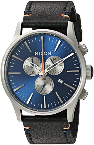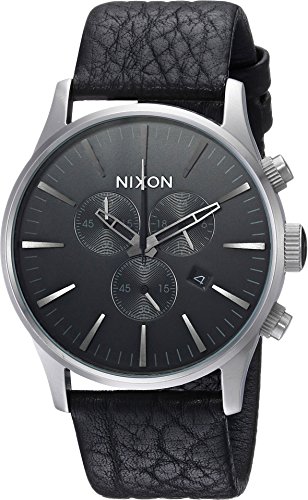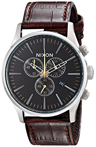 Nixon's Sentry design gets a chronograph face-lift. The 6-hand dial has faceted 5 marks and custom molded hands. 3 subdials. Japanese quartz movement, stainless steel case, and triple-crown design. Croc-embossed leather strap.