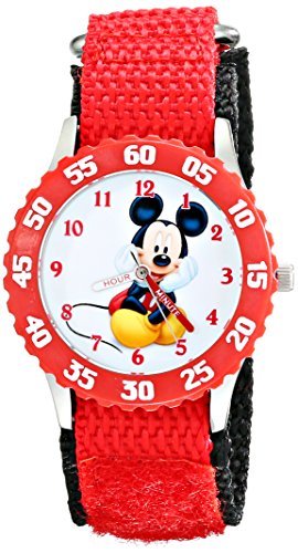 -. Binding : Watch -. Brand : Disney -. Color : Red -. Department : boys -. EAN : 0843231081123 -. Feature : Round Time Teacher Stainless Steel Watch with Disney's Mickey Mouse character on dial. / Meets or exceeds all US Govt requirements and regulations for Children's watches. / Recommended for Ages 3-7 years old. Includes a Time Teacher Punch Out clock for Parents to Teach their Children. / Accurate Japanese Quartz movement, scratch resistant mineral crystal, hook and loop Nylon strap / Water Resistant to 99 feet: withstands rain and splashes of water, but not showering or submersion. / 1 Year Limited Manufacturers Warranty -. Label : Disney-Roll up -. Manufacturer : Disney-Roll up -. Model : W001912 -. MPN : W001912 -. PackageQuantity : 1 -. PartNumber : W001912 -. ProductGroup : Watch -. ProductTypeName : WATCH -. Publisher : Disney-Roll up -. Studio : Disney-Roll up -. Title : Disney Kids' W001912 Mickey Mouse Analog Watch With Red Strap -. UPC : 843231081123