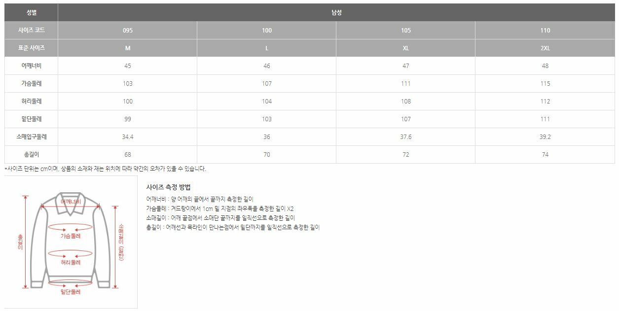 | 치수 | 실측(100)사이즈(cm)-가슴둘레104 어깨너비43 소매길이23 총장70 |