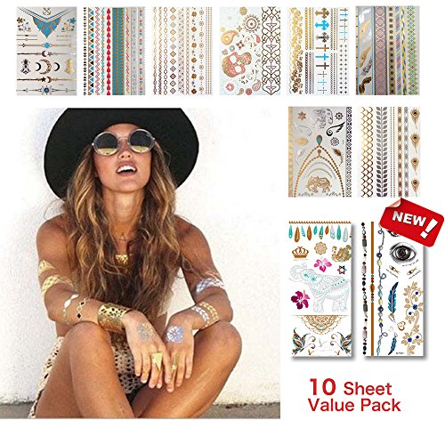 -. Title : Metallic Temporary Tattoos, 10 Sheets Premium Tattoos Designs in Gold, Silver, Black - Temporary Fake Jewelry Tattoos