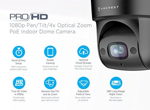 -. Feature : Premium HD 1080p Video Resolution at 30 Frames Per Second. Crisp, clean, cut image quality available on any Amcrest or ONVIF NVR, FTP, or Blue Iris to view recorded video and live stream on demand. Optional Amcrest Cloud Video Recording Service is also available with free live viewing and 4 hours of free video storage. / Remote Pan/Tilt with 4x Optical Zoom Wide 116° Rotating Field of View with Remote Pan and Tilt Functionality so you can take full control of your property and reach every angle whenever you need. The IP2M-846EB's powerful 4x Optical Zoom Lens also adds the extra added sense of security so you don't have to compromise any details in your image. / Impressive IR LED Night Vision of up to 98 ft. Sleep sound knowing the Sentinel is recording footage of up to 98 ft. in the dark. Be notified with intelligent motion alerts and check in anytime. The Sentinel is supported by multiple platforms and can be streamed from any smartphone, tablet, Mac or PC with internet access. / This is a Power Over Ethernet (POE) camera and requires a separate POE Injector or POE Switch to operate. A power supply and a POE injector are NOT included, and are sold separately. We recommend purchasing an Amcrest POE Switch/Injector or POE NVR if you currently do not have any type of POE power supply. / Stay in Touch with Intelligent Motion Alerts, Email Alerts/Snapshots as well as Mobile and Web Apps (Safari, Firefox, IE Supported - Chrome Supported on Amcrest Cloud). All cameras CE and FCC certified with UL compliant. Full 1-Year US Warranty and Lifetime Support Provided Directly from Amcrest.