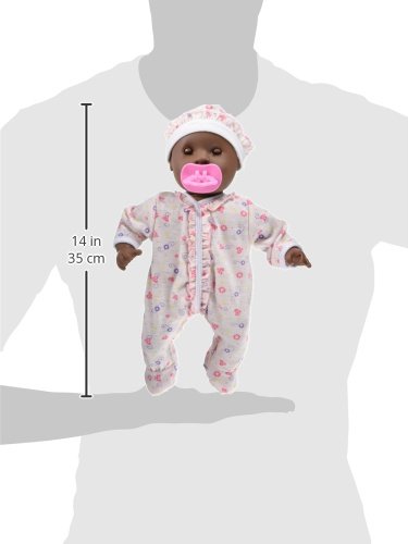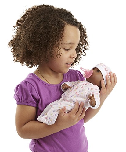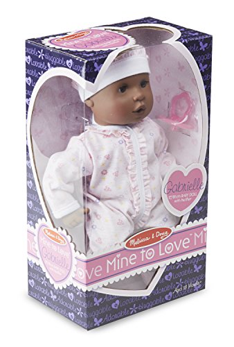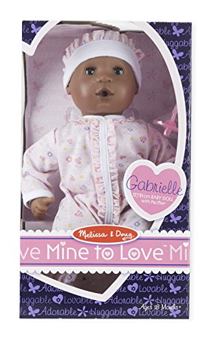 This adorable baby doll is just the right size to hug and cuddle. Gabrielle has molded plastic hair and her beautiful brown eyes open and close! She loves to be held and can also sit up "like a big girl." Her pretty frilled clothing features hearts and flowers and is removable for dressing and undressing fun, and she can suck her thumb or the included pink pacifier. Doll is 12" tall.Feature