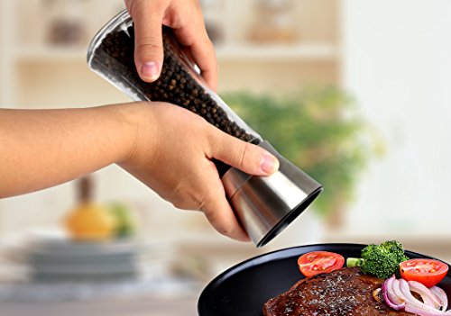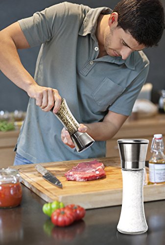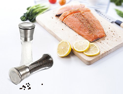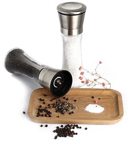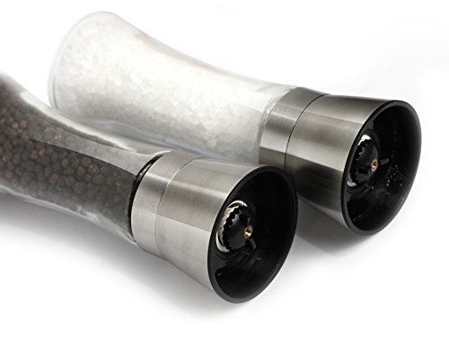 PREMIUM QUALITY GLASS AND STAINLESS STEEL GRINDER SET -- Our salt and peppermill pair features an elegant design and classic stylish superior appearance with brushed extremely durable stainless steel salt and pepper grinder. You will enjoy every bit of your cooking hours. Plus, this set adds a touch of elegance to your kitchen or dining table with exquisite workmanship, which makes a deluxe kitchen spice tool to compliment any home décor. It's perfect for home kitchen and restaurant use.