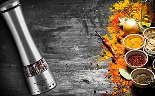 ✭ FATHER'S DAY 2017 DEAL! THE BEST ELECTRIC SALT & PEPPER GRINDER: ThIs electric mill allows you to grind your salt and pepper with unparalleled ease. Perfect for BBQ, CAMPING, PICNIC and much more! Unlike traditional hand mills, this battery operated grinder offers you amazing results just with the press of a button. You can even adjust the grinding coarseness just by turning a knob at the bottom, so that you can use the freshest spices in your recipes, in the size you want them to be!