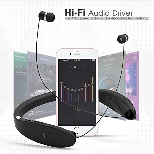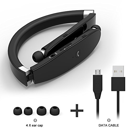 -. Feature : 1.Fashional foldable body and retractable earbuds design, special neckband in-ear style keep the earbuds stable in ear when you are doing sports. CVC noise reduction, echo cancellation, sweatproof, enjoying music anytime anywhere / 2.Bluetooth V4.1,CSR8645,HD stereo sound,built-in HD microphone, ensure Hi-Fi stereo music sound and strong signal, effective distance is about 10 meters/33ft ( Depend on environment, mobile phone and headset line distance) / 3.Super long battery life: Charging about 3.5 hour, you can have at least 16 hours continuous music time, 18 hours talk time and 300 hours standby time; Also, the indicating LED light will on when you are matching the digital equipment or charging the headphone / 4.Easy to operate: With the voice prompt, volume up /down,CH+/CH- control; Three different sizes of earbud,making your wearing more comfortable / 5.Never miss a call: Vibration for incoming call and broadcast phone number,you can receive a call even you are listening to rock music
