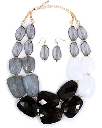 -. Binding : Jewelry -. Brand : Neu -. Department : womens -. Feature : 16 inch two strand white, black and gray translucent and transparent smoky gray acrylic bead necklace with matching dangle drop earrings. / Asymetrically shaped, lightly faceted beads ranging in size from approximately 1 ½ by 1 inch down to 1 x ½ inch and approximately 3/8 inch in thickness. / The necklace's shortest strand measures 16 inches in length with an additional 3 inches of wearable length available via extender chain. Lobster clasp closure. / The necklace 'drop' (the bib portion) is approximately 2 ½ inches in length as measured from the top of the first strand of beads to the lowest point of the second strand, when on. / The matching dangle drop pierced earrings measure ½ inch at the widest point and 1 3/4 inches in length as measured from the top of the ear wire. -. ProductGroup : Jewelry -. ProductTypeName : FASHIONOTHER -. Title : Black White Gray Translucent & Clear Acrylic Bead 2 Strand 16” Necklace with Dangle Drop Earrings