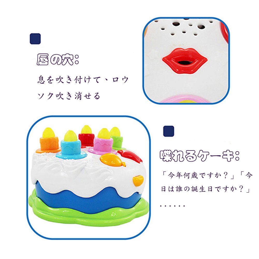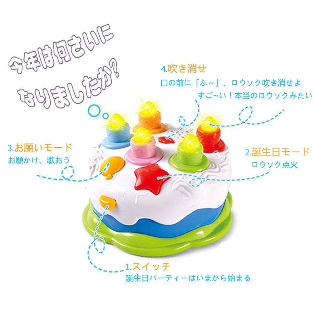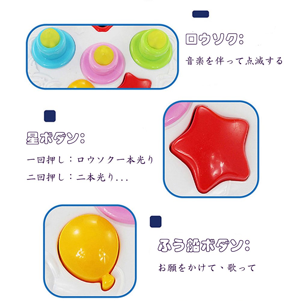 機能:全部で5本のロウソク。★押す一回と、ロウソク一本が明かり、全部のロウソクが明ってしまうまで、5回押せる。そして、誕生日の歌が終わって、願いをかけて、ロウソク吹き消す。お友達と一緒に楽しむ事ができます。