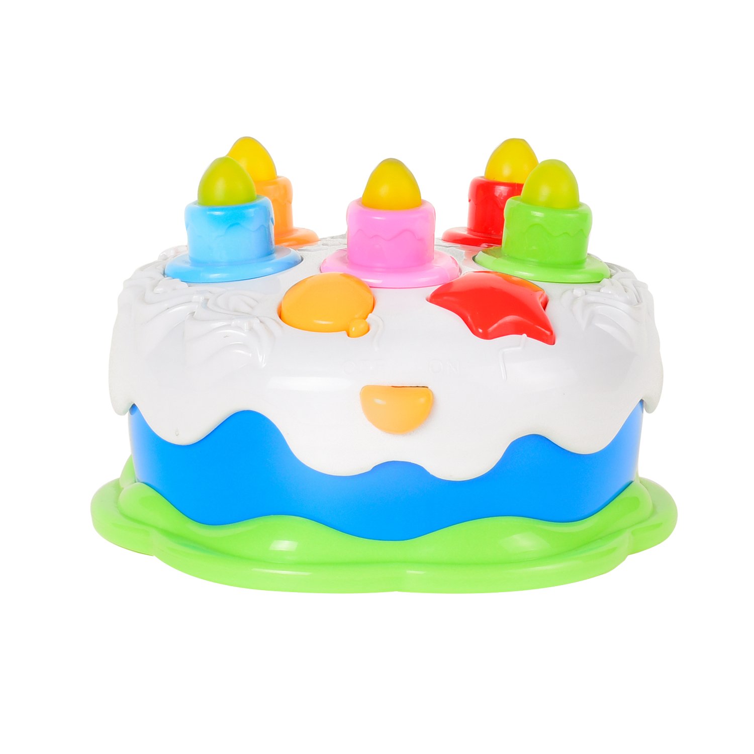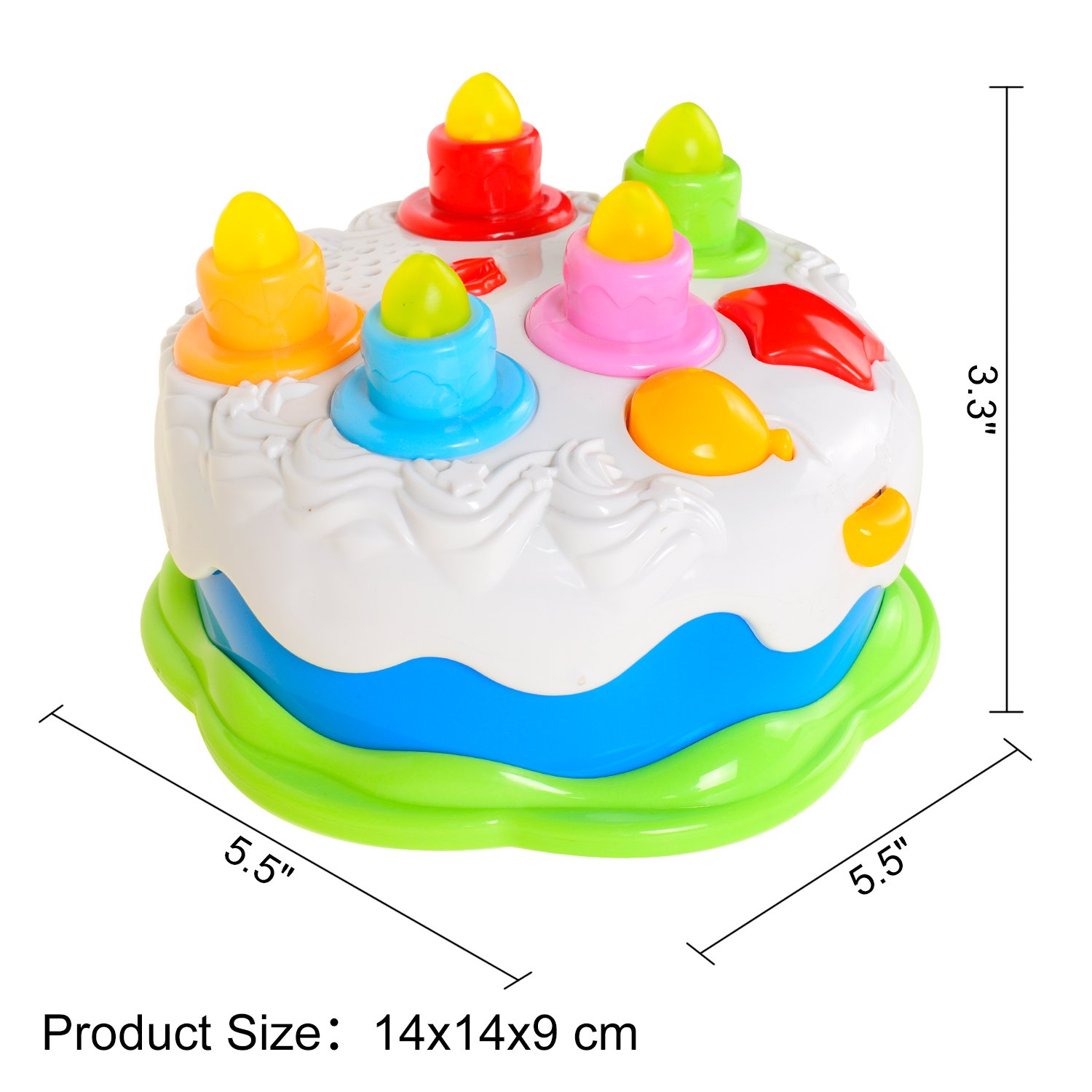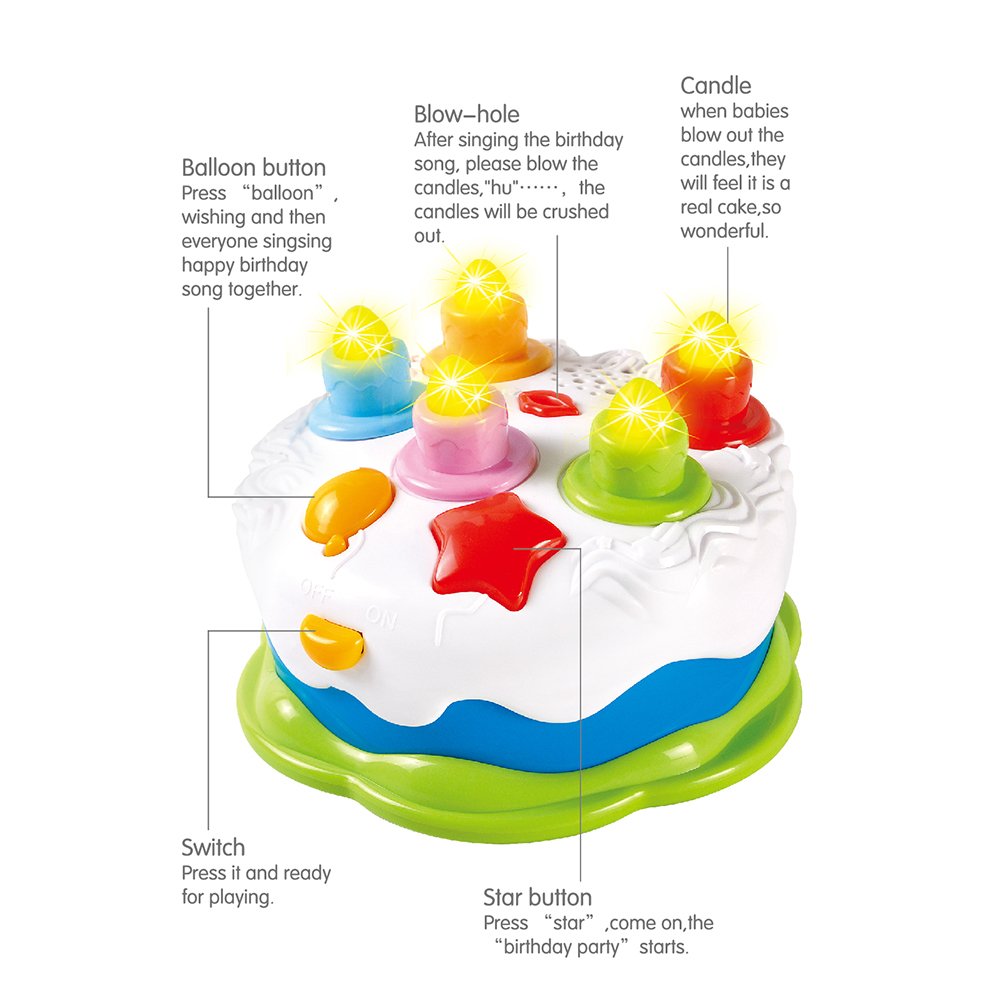 機能:全部で5本のロウソク。★押す一回と、ロウソク一本が明かり、全部のロウソクが明ってしまうまで、5回押せる。そして、誕生日の歌が終わって、願いをかけて、ロウソク吹き消す。お友達と一緒に楽しむ事ができます。