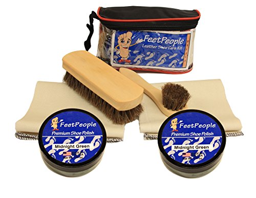 Product Description The FeetPeople Deluxe Leather Care Kit contains all the things you need to clean, nourish, buff, and shine your shoes. Our kit includes Two jars of our patented shoe polish that is a blend of pure carnauba wax, beeswax and the finest grade of other ingredients. One FeetPeople Horsehair Polish Brush that allow you to apply paste or cream polish quickly and easily. Keep your hands cleaner and let the applicator apply the polish. One FeetPeople 100% Horsehair Shine Brush has been designed to provide a nice buff finish for your shoes. This shine brush is simply packed with horsehair to make shining those shoes and boots much easier. While most shine brushes have 5 rows of horsehair, this brush has 6 rows, providing even more buffing power. Two Professional Shoe Shine Buffing Cloths to use after you completing apply the shoe polish on the shoe and done with the brushing. Use the shine cloth to obtain that mirror like finish. Our sturdy travel bag is great for keeping your shoe care products safely tucked away along with the giving you the option of taking it with you! 0
