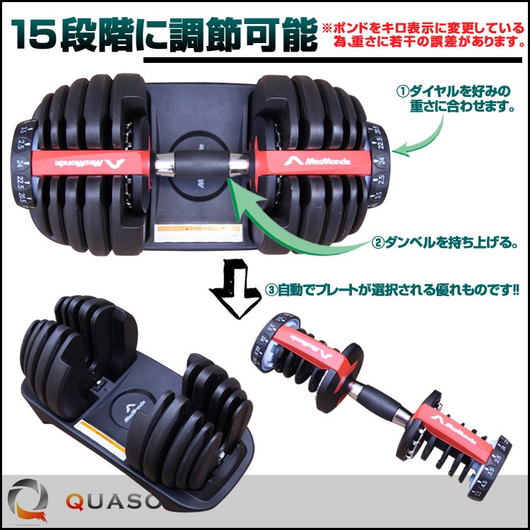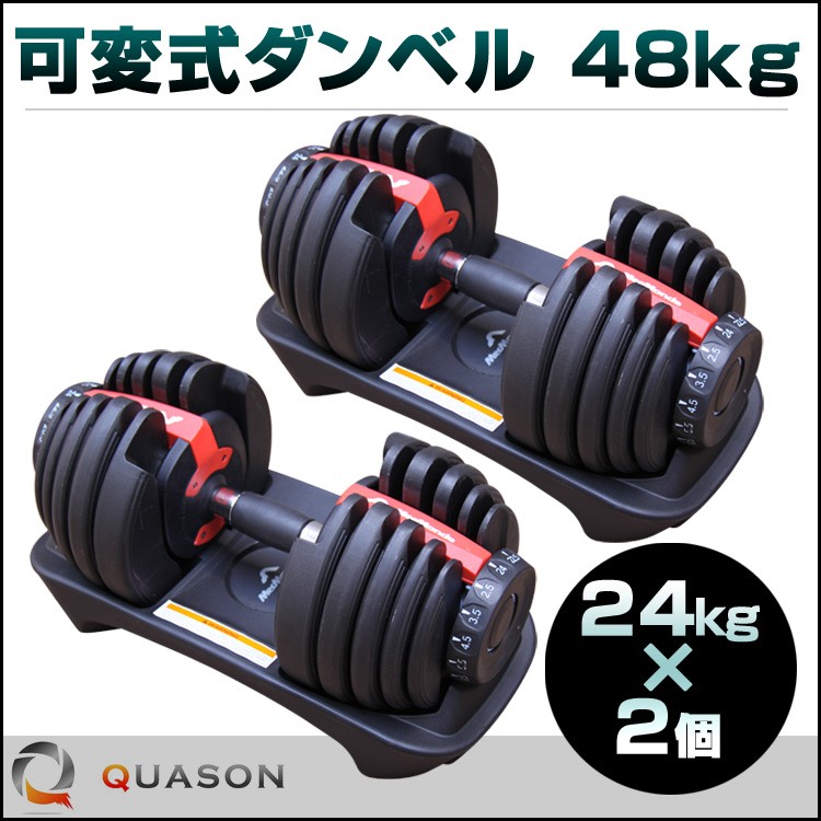 商品説明:●人気商品のダンベルに可変機能が加わりました!●状況に応じて2.5kg~24kgの調整が可能です。●ダンベル1個あたり最大約24kgとなります。 サイズ:ダンベル本体:横43cm×高さ23cm×奥行21cm重さ:ダンベル本体:約2.5kg~24kgダンベル台座:約2.3kg