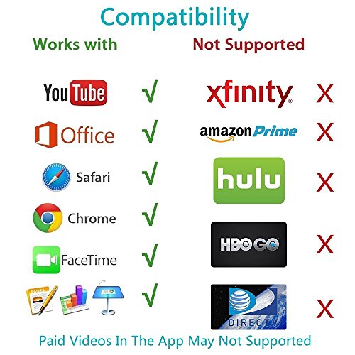 1080P HD: Support 1080P high digital signal output, you can enjoy the super big screen from your phones and share the happiness with your family or friend together on your big HDTV or projector! (NOT SUPPORT Netflix , Amazon Video , DIRECTV, hulu , crunchyroll or other Paid videos in the APP).