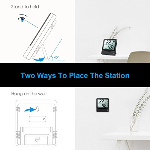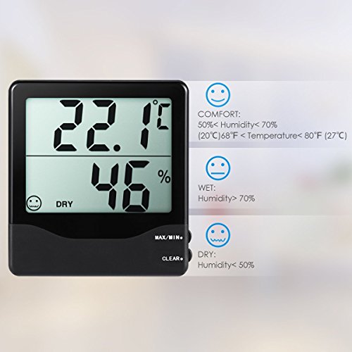 Description: AMIR Indoor Hygrometer Thermometer is simple indoor temperature and humidity meter. It shows the current data, extremum and comfort. You can place it on the table or hang it on the wall for your personal need, It's very convenient for you to plan to go out or stay at home. MIN/MAX Press button to display the minimum reading Press button again to display the maximum reading Press button again to return to normal reading CLEAR Press the CLEAR button to clear the MIN/MAX readings. °C/°F: Press the °C/°F button to switch between Centigrade and Fahrenheit. COMFORT INDDICATORS This unit display comfort icon in the RH% display to show if the surrounding atmosphere is too dry, right or too damp. BATTERY REPLACEMENT Replace the battery when the display dims, using AAA or 1.5V button battery. Specifications: - Dimensions: 11cm x 10.1cm x 2.2cm (4.33x3.97x0.87 inch) - Weight:120g - Temp Accuracy: ± 2°F/± 1°C - Humidity Accuracy: ±5% - Temperature Display Resolution: 0.1°C (0.1°F) - Humidity Display Resolution:1% - Measuring Temperature Range:32 to 122°F(0°C-50°C) - Measuring Humidity Range:10%Rh-99%Rh s - Battery: 1X1.5V (not included) - Cover Material:ABS plastic Note: Instrument performance may be affected if operated within a high frequency radio filed, such as near a mobile phone, or if subjected to an electrostatic shock. Package Included: 1 x Indoor Digital Weather Station 1 x User Manual Seller Warranty Policy: ● 45-Day Money Back Guarantee ● 12-Month Replacement Warranty ● 7/24 Online Customer Service ● Lifetime Support Guarantee 0 |