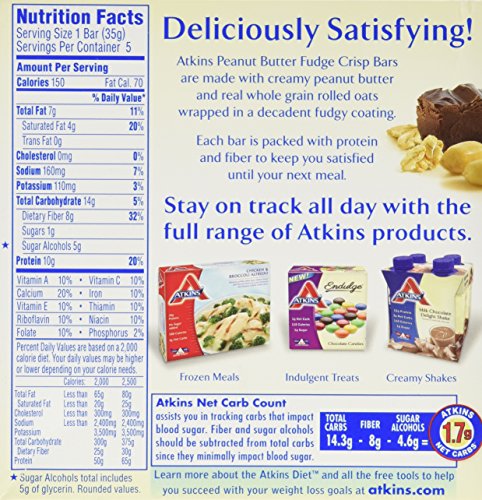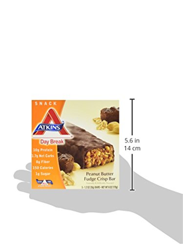 -. Binding : Health and Beauty -. Brand : Atkins -. EAN : 0637480055024 -. Feature : Atkins Day Break Bar Peanut Butter Fudge Crisp Description: 10g Protein1g Sugar8g Fiber150 Calories Only 2g Net Carbs The Atkins Diet is based on delicious low-carb recipes and whole foods / If your short on time, Atkins provides meal, snack and treat bars and shakes to keep you satisfied, even when you are on the go / Fiber, sugar alcohols, including glycerin, should be subtracted from the total carbs since they minimally impact blood sugar / The Net Carb Count helps you count carbs that impact blood sugar / This product can be used in all Phases of the Atkins Diet What can Atkins Bars do for you? Advantage Meal - Great as a satisfying meal, or can be used as a super-filling snack / Atkins day break bar peanut butter fudge crisp / The Atkins Diet is based on delicious low-carb recipes and whole foods / Fiber, sugar alcohols, including glycerin, should be subtracted from the total carbs since they minimally impact blood sugar -. IsAdultProduct : 0 -. IsAutographed : 0 -. IsMemorabilia : 0 -. Label : Atkins -. LegalDisclaimer : Actual product packaging and materials may contain more and different information than what is shown on our website. We recommend that you do not rely solely on the information presented and that you always read labels, warnings, and directions before using or consuming a product. Please see our full disclaimer below. -. Manufacturer : Atkins -. Model : ATK-05502 -. MPN : 637480055024 -. NumberOfItems : 1 -. PackageQuantity : 1 -. PartNumber : 637480055024 -. ProductGroup : Health and Beauty -. ProductTypeName : HEALTH_PERSONAL_CARE -. PublicationDate : 2015-01-24 -. Publisher : Atkins -. ReleaseDate : 2015-01-21 -. Size : 5 -. Studio : Atkins -. Title : Atkins Day Break Peanut Butter Fudge Crisp Bar, 5 Count -. UPC : 742128658250