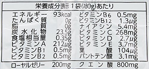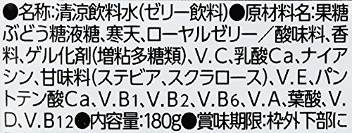 果糖ぶどう糖液糖、寒天、ローヤルゼリー/酸味料、香料、ゲル化剤(増粘多糖類)、V.C、乳酸Ca、ナイアシン、甘味料(ステビア、スクラロース)、V.E、パントテン酸Ca、V.B1、V.B2、V.B6、V.A、葉酸、V.D、V.B12