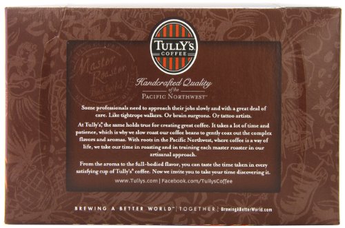 ABOUT TULLY'S: Some professionals need to approach their jobs slowly and with a great deal of care. Like tightrope walkers. Or brain surgeons. Or tattoo artists. At Tully’s, the same holds true for creating great coffee. It takes a lot of time and patience, which is why we slow roast our coffee beans to gently coax out the complex flavors and aromas. With roots in the Pacific Northwest, where coffee is a way of life, we take our time in roasting and in training each master roaster in our artisanal approach. From the aroma to the full-bodied flavor, you can taste the time taken in every satisfying cup of Tully’s coffee. Now we invite you to take your time discovering it.