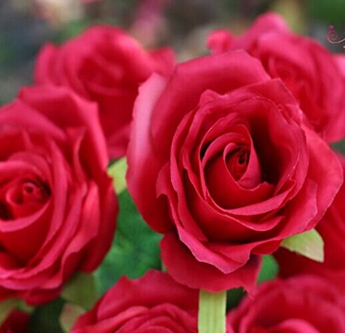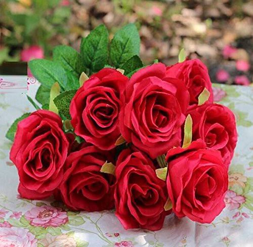 Real Real Artificial Rose, DIY Decoration and Flower Arrangement, Table Flower, Silk 10 heads (Red)