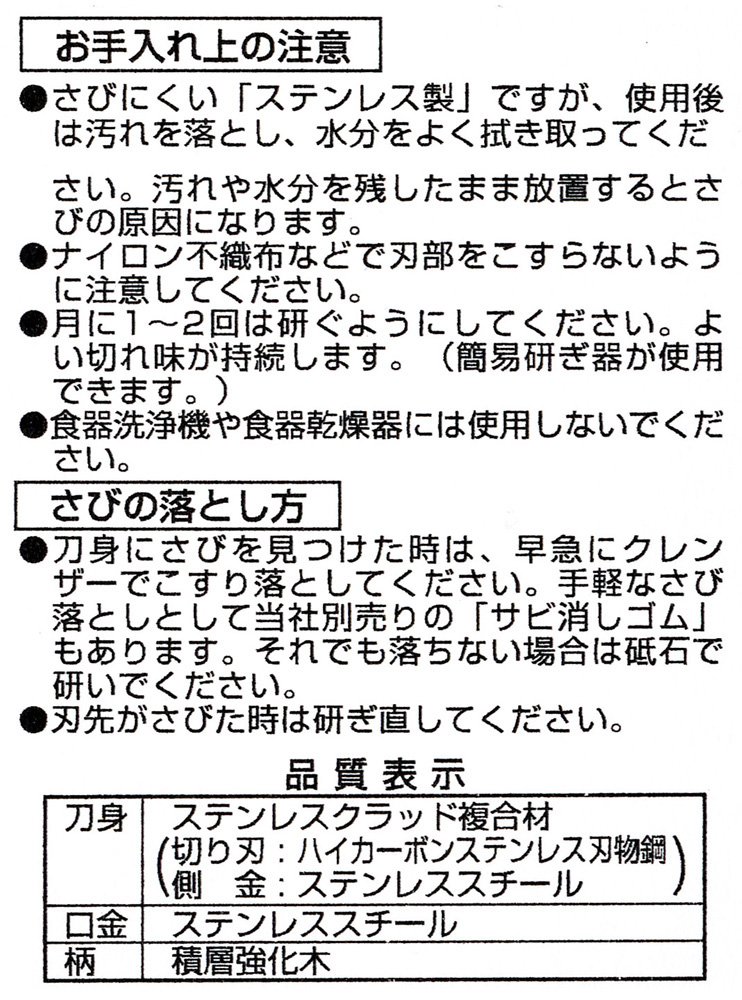 ● Country of Origin ● Japan ● Material ● Blade Body: Stainless Clad Composite Material (Ferrite: High Carbon Stainless Steel Blade Steel, Side Gold: Stainless Steel) Cap · Bottom Gold: Stainless Steel Pattern: Stacked Timber ● In Bulk Purchase