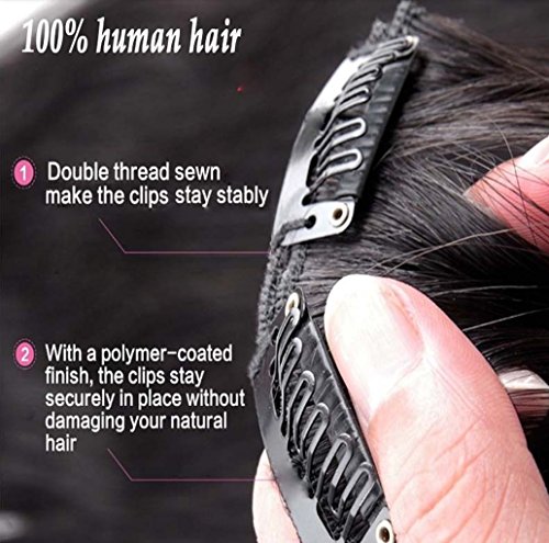 Feature: - Material:True Human Hairs - Color:1b Natural Black - Length:16inch - Touching feeling:smooth,soft because dealt with silicon conditioner - Best solution for an embarrassing moment - fast repair for a bad cut hair - Clips stitched on hairs and removable,replaceable. Don't bother your head, comfortable for all day wear - It is thin but very easy to blend into your natural hair Kindly Remind:One set is suitable for rare or thin hairs to add length volume, 2 sets for fine hair or slightly thick hair,if you have very thick hair,we suggest you buy 3 sets or more - We promise that the hair we sold is 100% pure human hair. If you get the defective products, you can exchange or money back within 30 days after you receive the hair - If you are not sure whether the hair color is match your hair, pls send your hair picture to us, we will give you some advise We are professional human hair extensions manufacturer and our factory warehouse is located in California,United States.Our Remy Human Hair Extensions have sold in many stores for several years and got many good feedbacks,but this is the first time we try to sales online. So you would get the best quality human hair extensions but in competive price Package included: 2*8"(20cm) wide wefts with 3 clips per weft 2*6"(15cm) wide wefts with 3 clips per weft 2*4"(10cm) wide wefts with 2 clips per weft 2*2"(5cm) wide wefts with 1 clips per weft 0 |