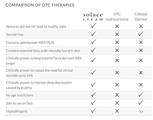 -. Feature : Now Available Without a Prescription - SOLACETM CREAM, Clinically Proven Safe & Effective Eczema Relief / SolaceTM Cream is the first and only triple functioning daily non-steroidal cream that restores integrity of the healthy skin barrier, manages signs and symp while extending disease remission / SolaceTM Cream contains a unique composition of skin based lipids, to help restore the skin barrier, and a natural occurring (endogenous) fatty acid Palmitamide MEA (PEA), providing soothing antioxidant affects / SolaceTM Cream is clinically proven to reduce the need for topical steroids by 56% of patients and improve overall sleep quality in eczema patients / Hypoallergenic - Free of dyes, fragrance, SLS/SLES & parabens / Safe to use on all ages / No duration of use limitations and safe to use on face