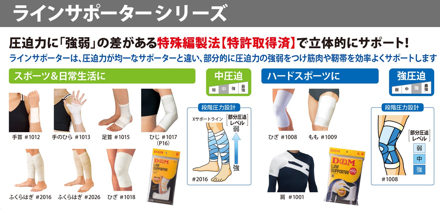 The line supporter adopts a special knitting manufacturing method which has a difference in strength in compression force and supports muscles and ligaments efficiently.