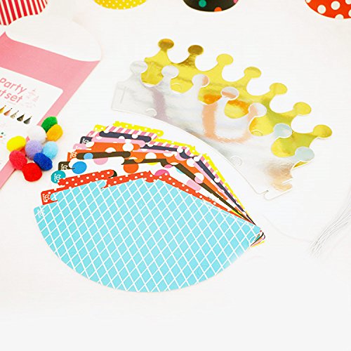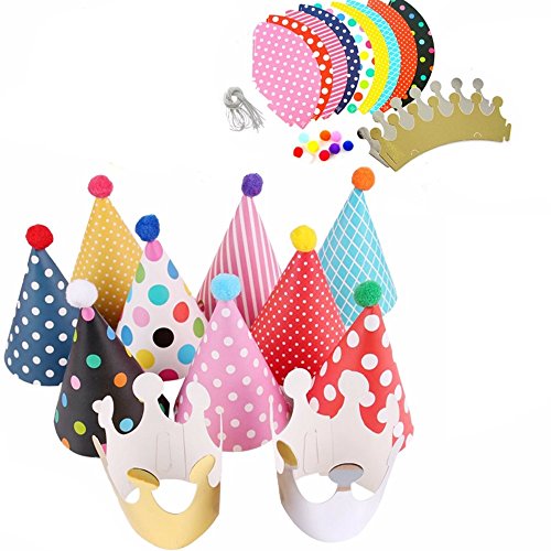 SelfTek 9 Pack Birthday Party Cone Hats with Pom Poms and 2 Crowns for Children and Adult