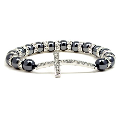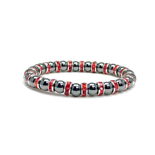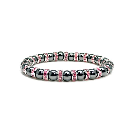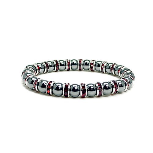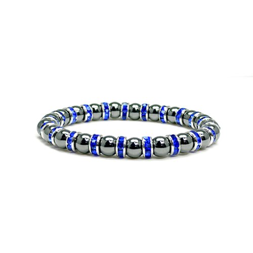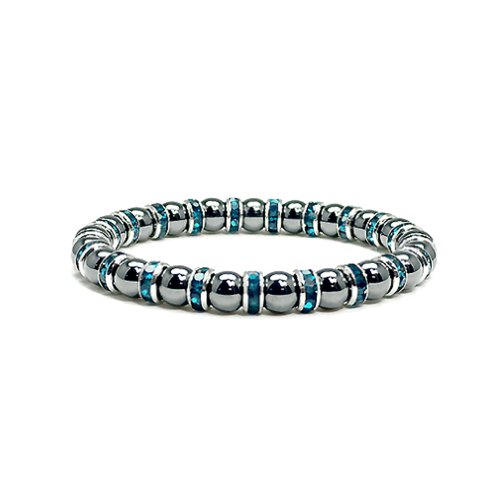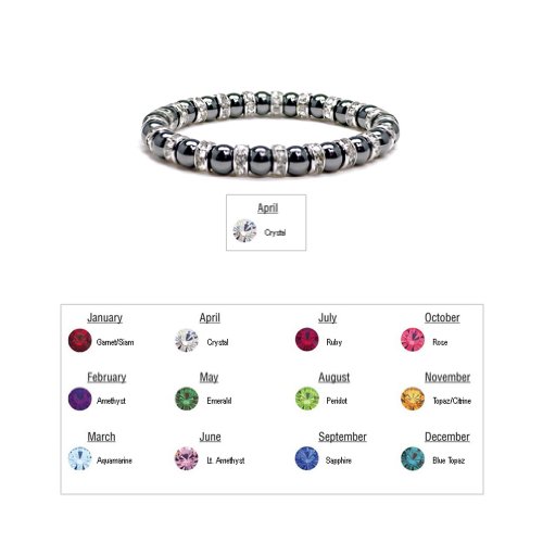 Accents Kingdom ® introduces a magnetic hematite trendy bracelet with simulated clear crystal April birthstone. This shiny black gun metal looking beaded bracelet is accented with Austrian crystal rondells , it is eye-catching wherever it appears. The bracelet measures 7.5" long and 1/3" wide(8MM) with a strong stretch strap and very comfortable to wear. A perfect birthday gift present for her!Feature