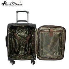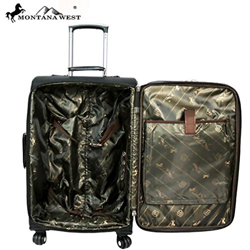 Product Description Made of the highest quality PU leather and partial leather, this 3 piece set has floral tooling on genuine leather. Each piece is.decorated with rhinestones and silver studs. Sold in sets of 3 Each this set has the following size combination: Large : 16" x 10"x 26 Medium : 13.5" x 9 "x 20" Carry-on : 16" X 7.5" X 11" ?(handle 9") Top and side carry handles 4 wheel spinner system for easy 360 degree rolling. Telescoping trolley handles are recessed and feature push-button locking mechanism Zip-Around Closure 2 front exterior zipper pockets Fully lined interior Interior zippered and open accessory pocket Adjustable valet straps. Carry-on : Tooled design on the genuine leather flap that snap close. A zipper enclosure for the entire bag. A zippered pocket on the inside back and 2 open pockets on the inside front. A zippered and an open pocket on the back. Is double handled 0