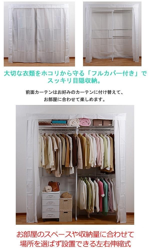 お部屋のスペースや収納量に合わせ、場所を選ばず設置できる左右伸縮式ハンガーラック。大切な衣類をホコリから守る「フルカバー付き」で、スッキリ目隠収納。前面カーテンはお好みのカーテンに付け替えOK!! |