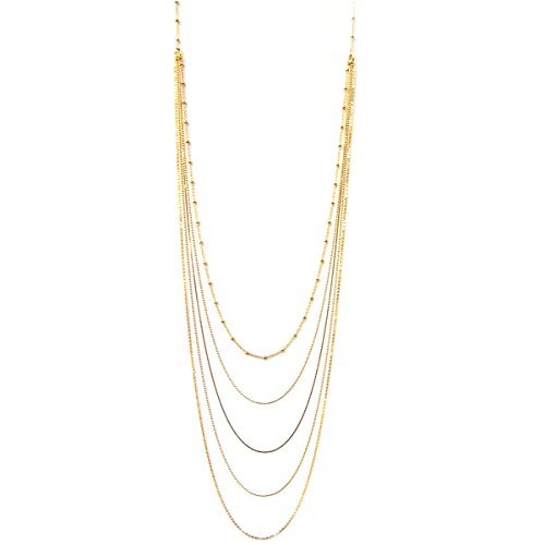 Five different styles of delicate chain are combined for the layered look and lots of sparkle. Cable chain with periodically spaced beads extends the necklace with a single clasp for easy wear. The other chain styles are serpentine, 1mm ball, flat cable. Order of the chains may vary. Entire necklace is 18k gold-flashed solid 925 sterling silver imported from Italy. Gift box included, color or style may vary.Feature