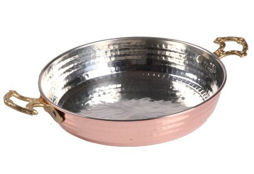 EGG / OMELETTE / PAELLA PAN with BRASS HANDLES Copper Double Handled (Brass) Sahan - 21 cm SOLID COPPER (Tinned Interior Surfaces) Made in TURKEY Brand : The Turkish Emporium MPN(PartNumber) : SAHAN21 EAN : 5055861700342 Package Dimensions(LxWxH) : 14x14x4cm ; 299 g