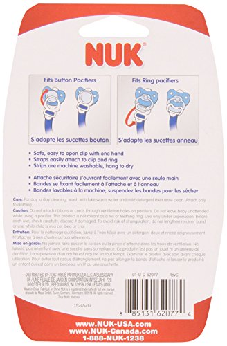 -. Binding : Baby Product -. Brand : NUK -. Color : Assorted Colors -. Department : baby-boys -. EAN : 0885131620774 -. Feature : NOTE: This is an assorted product; color and P.R.Int advertised are subjected to vary. / 3-in-1 Pacifier Clip helps keep pacifier clean and off the floor / Fits most pacifiers (both pullers and buttons) / Easy-to-use and interchangeable / Plastic clip opens easily with one hand and is safe for baby / Works with ALL leading pacifier brands -.Safe 1-piece design -.Easily attaches to button or ring design pacifiers -. Label : NUK -. Manufacturer : NUK -. Model : 62077 -. MPN : 62077 -. PackageQuantity : 1 -. PartNumber : 62077 -. ProductGroup : Baby Product -. ProductTypeName : BABY_PRODUCT -. Publisher : NUK -. ReleaseDate : 2015-07-14 -. Studio : NUK -. Title : NUK 62077 Fashion Pacifier Clip, Assorted Colors -. UPC : 885131620774
