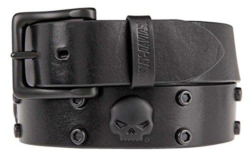 -. Feature : Harley-Davidson® Men's Doom Roller Genuine Leather Belt / Constructed from high-quality Genuine black leather / Complete with an interchangeable matte black finish buckle / Features matte black engraved Willie G Skull emblems and an awesome repeated rivet design / This belt is tough and ready for the ride