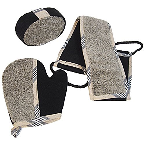 Native Spring 3-piece Exfoliating Spa Bath Set, Back Body Loofah Scrubber, Shower Glove and Pouf Sponge, For Men and Women, Soft Enough On Kids or Sensitive Skin, In Charcoal & Black