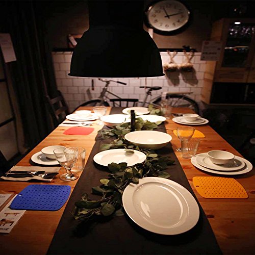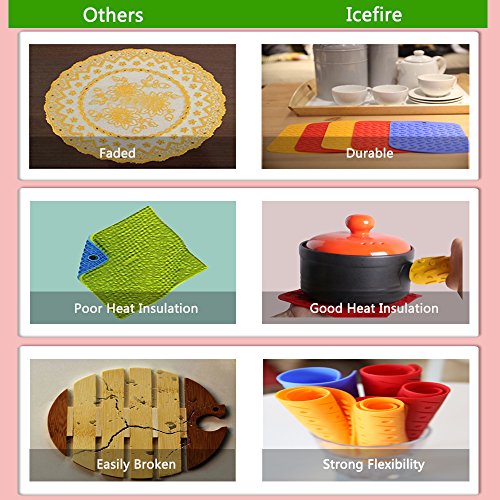 ❤ 2.HIGH QUALITY: Icefire silicone dish drying mats & pads are made of FDA Approved Food Grade Silicone.Safe,No Slip and Flexible,Heatproof,No-Stick,No-Fade and Durable.Our coffee pot holder thickness is very adequate.They won’t stain, Mold or Absorb Odors. It’s safe to use in and out of the kitchen.These heatproof placemat are thick enough that the heat doesn't go through and burn your hands.These have prevented wooden and glass table from warping and heat damage.toaster oven dishwasher safe.