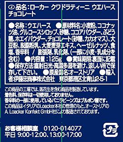 原材料:小麦粉、ココナッツ油、グルコースシロップ、砂糖、ココアパウダー、ぶどう糖、ホエイパウダー、チョコレート、砂糖、カカオマス、大豆粉、脱脂粉乳、大麦麦芽エキス、膨張剤、炭酸水素Na、ピロリン酸二水素二Na、ヘーゼルナッツ、乳化剤、食塩、香辛料、ブルボン種バニラビーンズ、香辛料その他