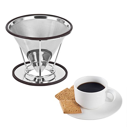 - DOUBLE LAYER NET COFFEE FILTER,the inner net is stainless steel yarn net, can filter about 99.9% coffee grounds. The outer net is stainless steel round hole net, combined with the inner net, more effectively filter the coffee grounds,the dripper is durable and reusable and an extended lip on the base of the dripper keeps it secure on your mug while you brew.