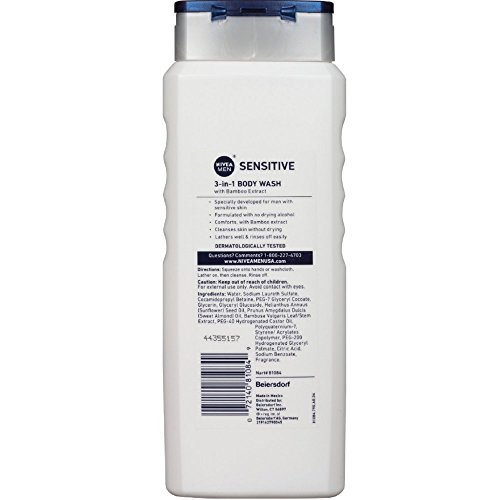 -. Binding : Health and Beauty -. Brand : Nivea -. Feature : A gentle soap free formula cleanses without drying, leaving your skin feeling refreshed and comfortable / Nivea Sensitive Body Wash is Soap-Free. -. Label : NIVEA -. Manufacturer : NIVEA -. ProductGroup : Health and Beauty -. ProductTypeName : HEALTH_PERSONAL_CARE -. Publisher : NIVEA -. Studio : NIVEA -. Title : Nivea for Men Body Wash, Sensitive, 16.9 oz (PACK OF 2)