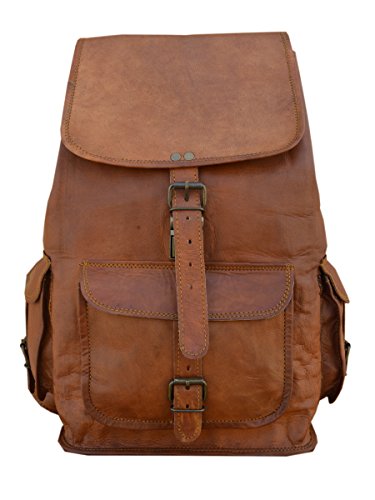 -. Feature : Dimensions : 16" inches ( Height ) x 9" inches ( Length ) x 7" inches ( Depth ) / Made from naturally processed and tanned leather, strong, lightweight, durable goat leather, tanned without the use of chemicals. / A perfect leather backpack for documents, laptop, notebook and i pad etc, A perfect vintage leather bag for great looks and fashion, hand crafted product by experienced craftsman, high quality long lasting zippers, a genuine hand made product using natural leather. / Canvas lining and best quality accessories furnished / Bag have 3 pockets out side, one zippered pocket inside and adjustable padded shoulder strap, easy to open fastener