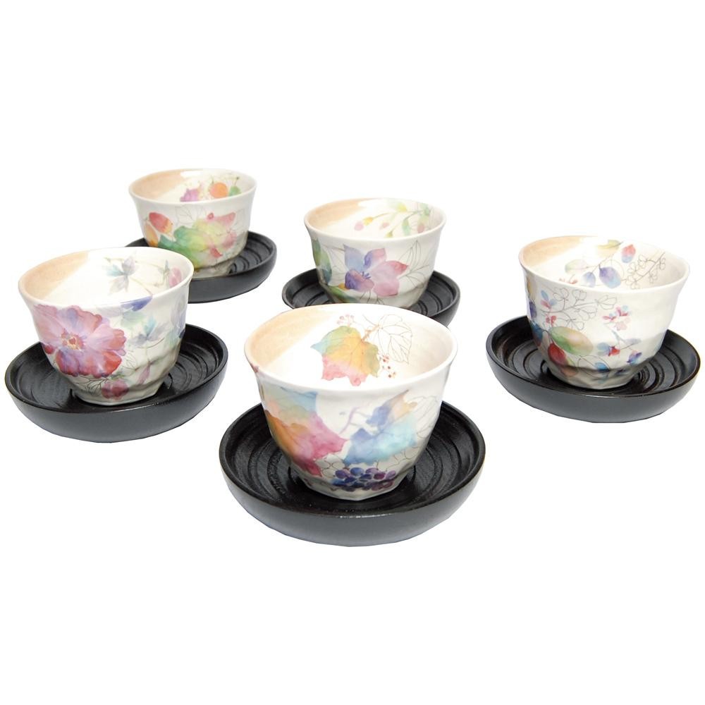 鮮やかにぼたん、ぶどう、萩、桔梗、からすうりを描いた煎茶碗と茶托の5客セットです。大切な方へのギフトとしても最適です。 |