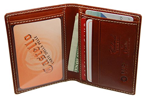 -. Binding : Apparel -. Brand : Castello -. Department : mens -. Feature : *Top Grain Italian Leather / *3 credit card slots,*ID window,*2 pockets for cash or additional cards / *This Castello wallet has an advanced material, which blocks RFID signals and secures valuable P.R.Ivate information stored on your RFID chipped credit card from unauthorized scans. / *Eliminates bulging back pocket of your dress pants or jeans.*Wallet can fit nicely in front pocket of your pants / * Gift box included *Size: 2.8inches wide x 4 inches long -. ProductGroup : Apparel -. ProductTypeName : ACCESSORY -. Size : One Size -. Title : Castello Italian RFID Slim Bi-Fold Card Leather Wallet