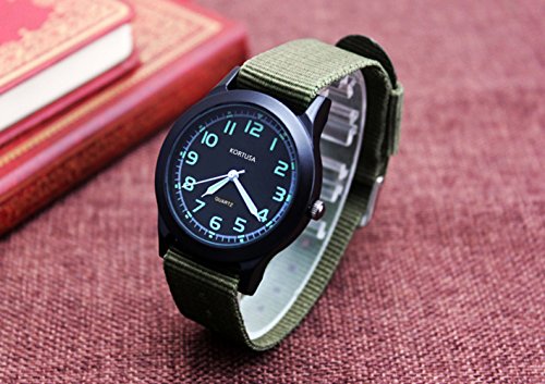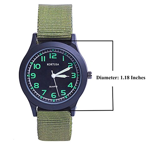 Brand, Seller, or Collection Name:Kortusa Model number:KW20 Part Number:KW20 Item Shape:Round Display Type:Analog Clasp:Buckle Case material:Metal Case diameter:1.18 inches Case Thickness:0.28 inches Band Material:Nylon Band length:Children's Band width:0.55 centimeters Band Color:Green Dial color:Black Special features:Backup battery Item weight:2.40 Ounces Movement:Analog quartz