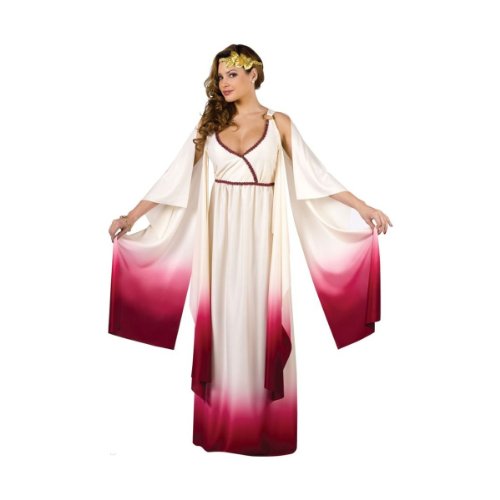 - Includes sleeveless, empire cut, full-lengthgreek silhouette gown, fitted cross-over bodice with gold ring strap accent, full cut gown skirt with cream top to burgundy ombré dip, 2 pair matching shoulder and arm drapes, gold metallic gimp trim on bodice a waist and gold elastic gimp headband with gold leaves