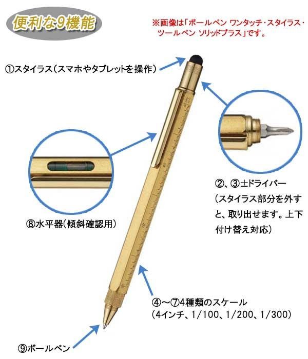 | スタイラス、プラス・マイナスのドライバー、4つの異なるスケールなど、9機能が1つのペンに収まったモンテベルデらしい遊び心ある多機能ペンです。 |