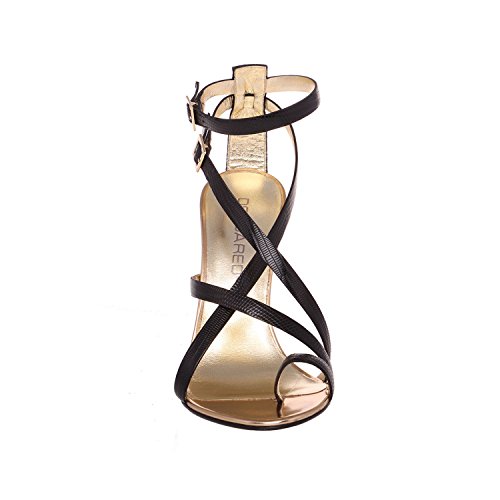 Adjustable gold-tone double buckle closure at ankle and side strap