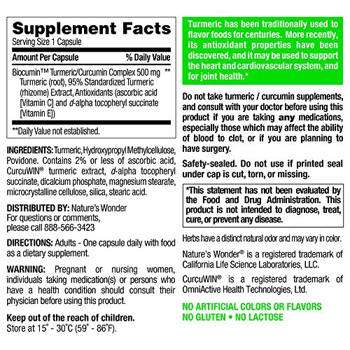 -. Binding : Health and Beauty -. Brand : Nature's Wonder Nature's Wonder -. EAN : 0859663007273 -. Feature : May help maintain a healthy heart and cardiovascular system / Natural antioxidant support / May support immune health / No artificial colors or flavors, no gluten, no lactose -. Label : California Life Science -. Manufacturer : California Life Science -. NumberOfItems : 1 -. PackageQuantity : 1 -. ProductGroup : Pantry -. ProductTypeName : HEALTH_PERSONAL_CARE -. Publisher : California Life Science -. Studio : California Life Science -. Title : Nature's Wonder Turmeric 500 mg Capsules 500ct -. UPC : 859663007273