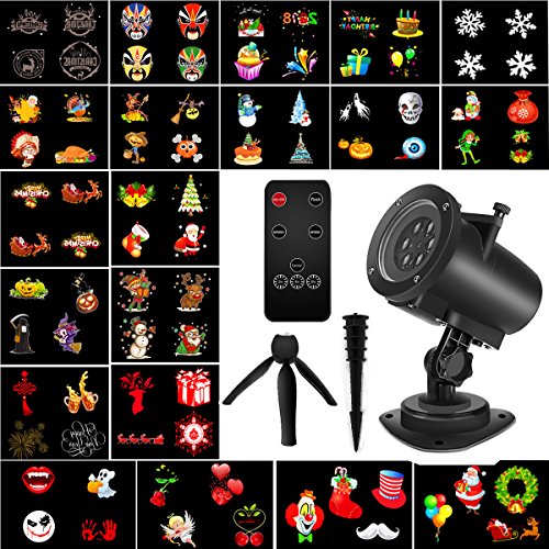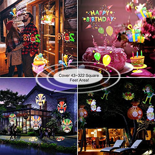 20 SLIDES & 5 LIGHTING MODES DECORATIVE LIGHTING: 20 pieces multi-color gobo cards with different themes: 8 pieces Christmas themes, 2 piece New Year theme, 4 piece Halloween themes, 1 piece Thanksgiving Day themes, 1 piece Valentine's Day theme, 1 piece birthday theme, 1piece clown theme, 1 piece snowflake and 1 piece Sichuan facebook themes.