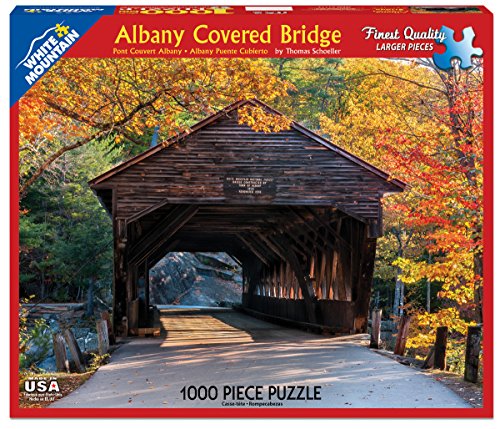 -. Binding : Toy -. Brand : White Mountain Puzzles -. Department : New York -. EAN : 0724819257638 -. Feature : Just west of New Hampshire's scenic Kancamagus Highway, the Albany Covered Bridge spans the Swift River. / Artist Thomas Schoeller is a freelance photographer who loves to capture the diverse natural landscapes both grand and small / Every White Mountain Puzzle is proudly manufactured in America with a 100% customer satisfaction guarantee / All our puzzles contain unique interlocking pieces that are made of sturdy blue chipboard on recycled paper / 1000 piece puzzles measure 24"x30" - larger pieces for easy handling -. IsAdultProduct : 0 -. ItemPartNumber : 1117 -. Label : White Mountain Puzzles, Inc. -. Manufacturer : White Mountain Puzzles, Inc. -. Model : 1117 -. MPN : 1117 -. NumberOfItems : 1 -. PackageQuantity : 1 -. PartNumber : 1117 -. ProductGroup : Toy -. ProductTypeName : TOYS_AND_GAMES -. Publisher : White Mountain Puzzles, Inc. -. Studio : White Mountain Puzzles, Inc. -. Title : White Mountain Puzzles Albany Covered Bridge - 1000 Piece Jigsaw Puzzle -. UPC : 724819257638 -. Warranty : No Warranty