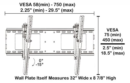 -. Feature : Color: Black scratch resistant finish / Fits most 36" to 63" LCD and Plasma Tv's (Supports VESA Standards up to 750 x 450) / Tilt Feature: 0° to -15° Degrees - Variable Downward Tilt / Maximum Weight Capacity: 165 lbs / Quick & easy installation with included mounting hardware